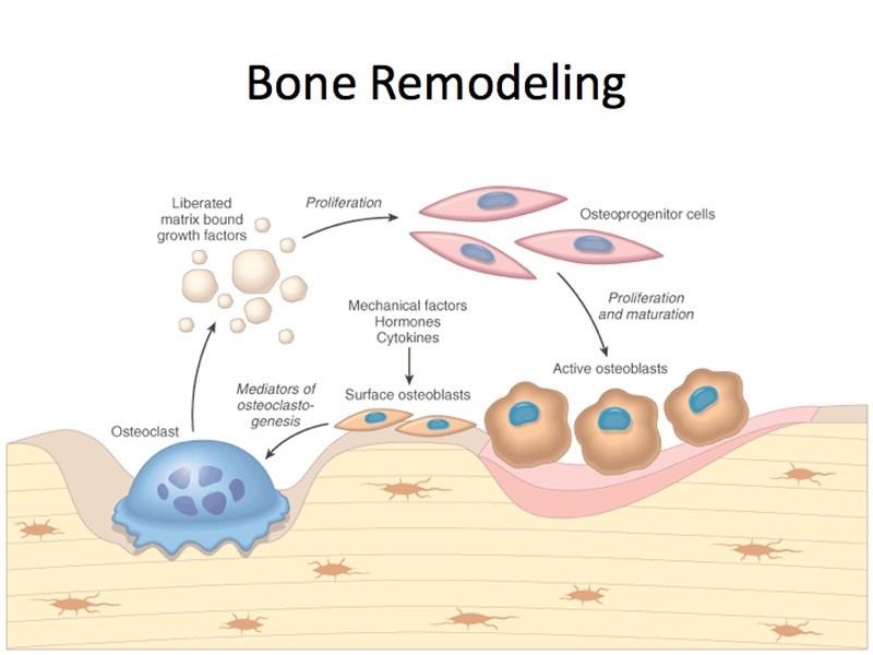 bone undergoes a permanent remodeling throughout life,this process involves two sub processes :the removal of mineralized bone by a type of cells called osteoclasts and the fromation of new bone matrix by an other type of cells called osteoblasts followed by a subsequent mineralization ( fixation of calcium and phosphates) .